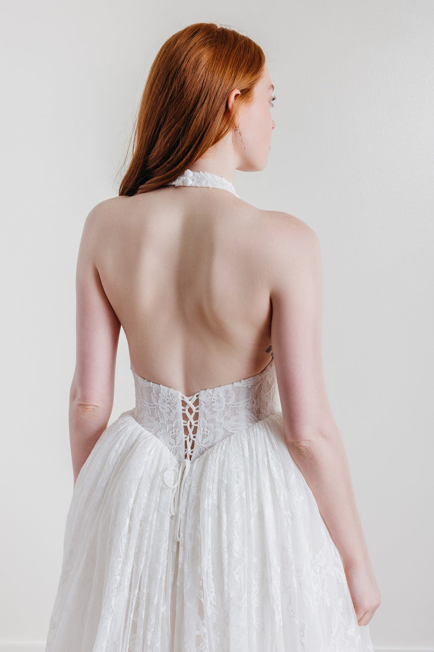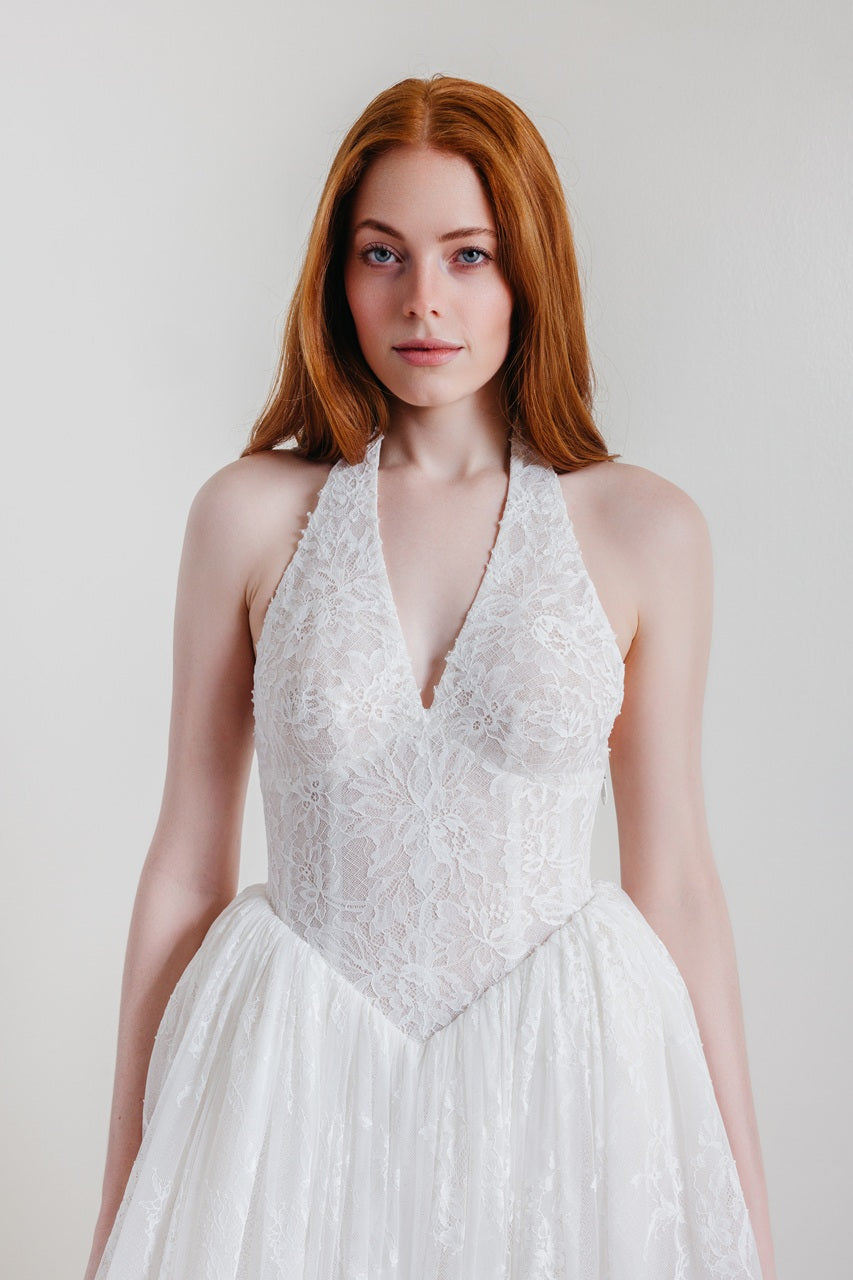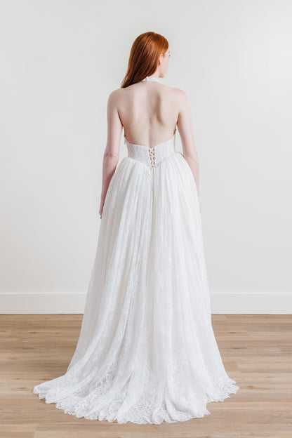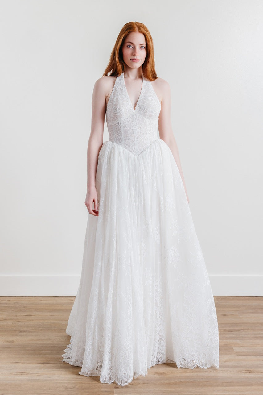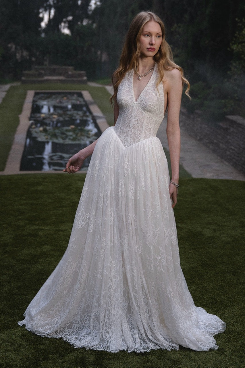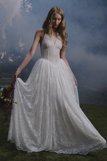 A modern take on vintage romance, the Prince gown by Willowby is all about effortless elegance. The halter-style lace bodice draws the eye with a plunging V-neckline and soft floral texture, while the dramatic drop waist adds a flattering, sculpted shape. A full A-line skirt of delicate lace flows into a sweep train, creating a look that moves with grace and ease. Whether you're twirling on the dance floor or walking down the aisle, this gown makes every moment unforgettable.