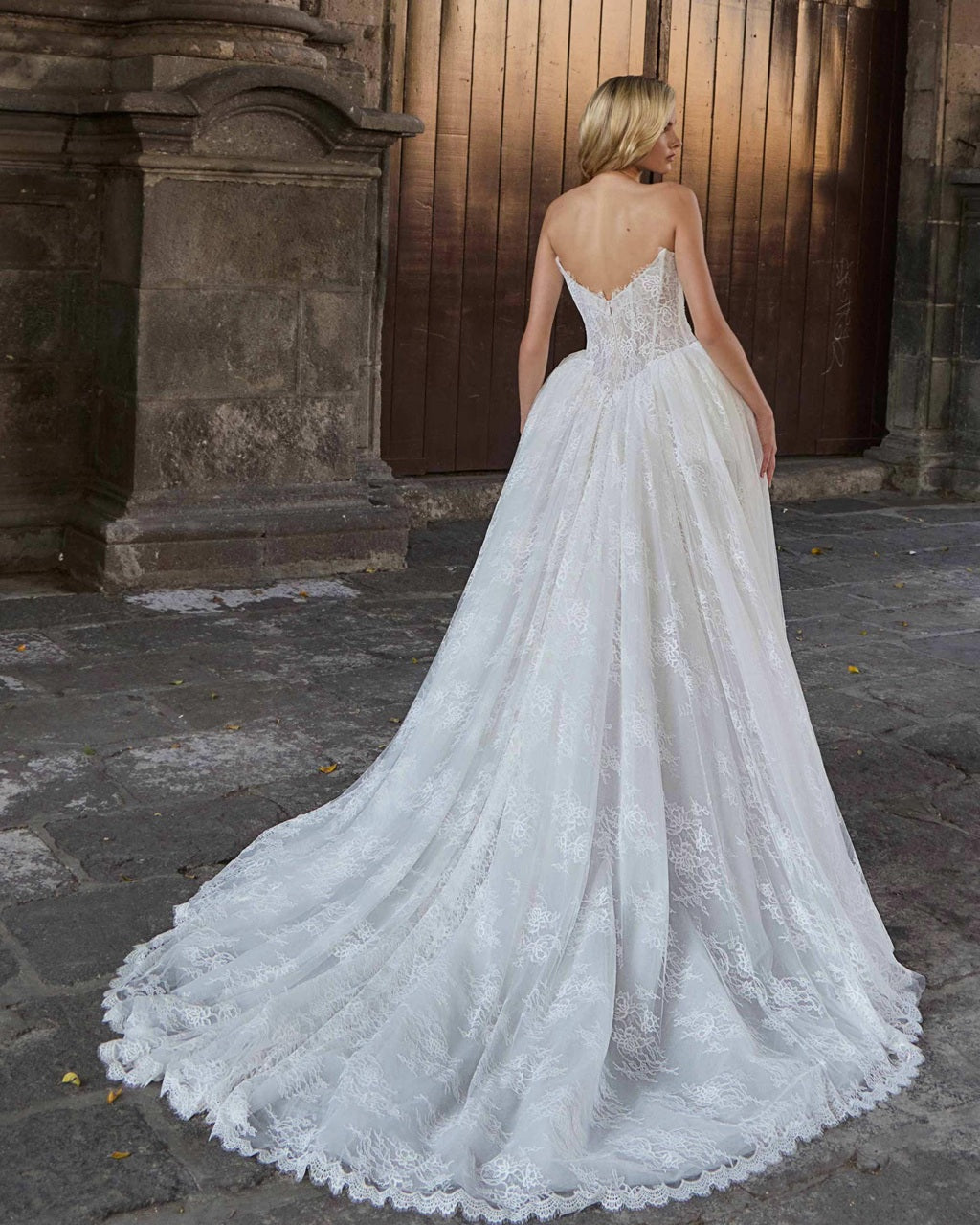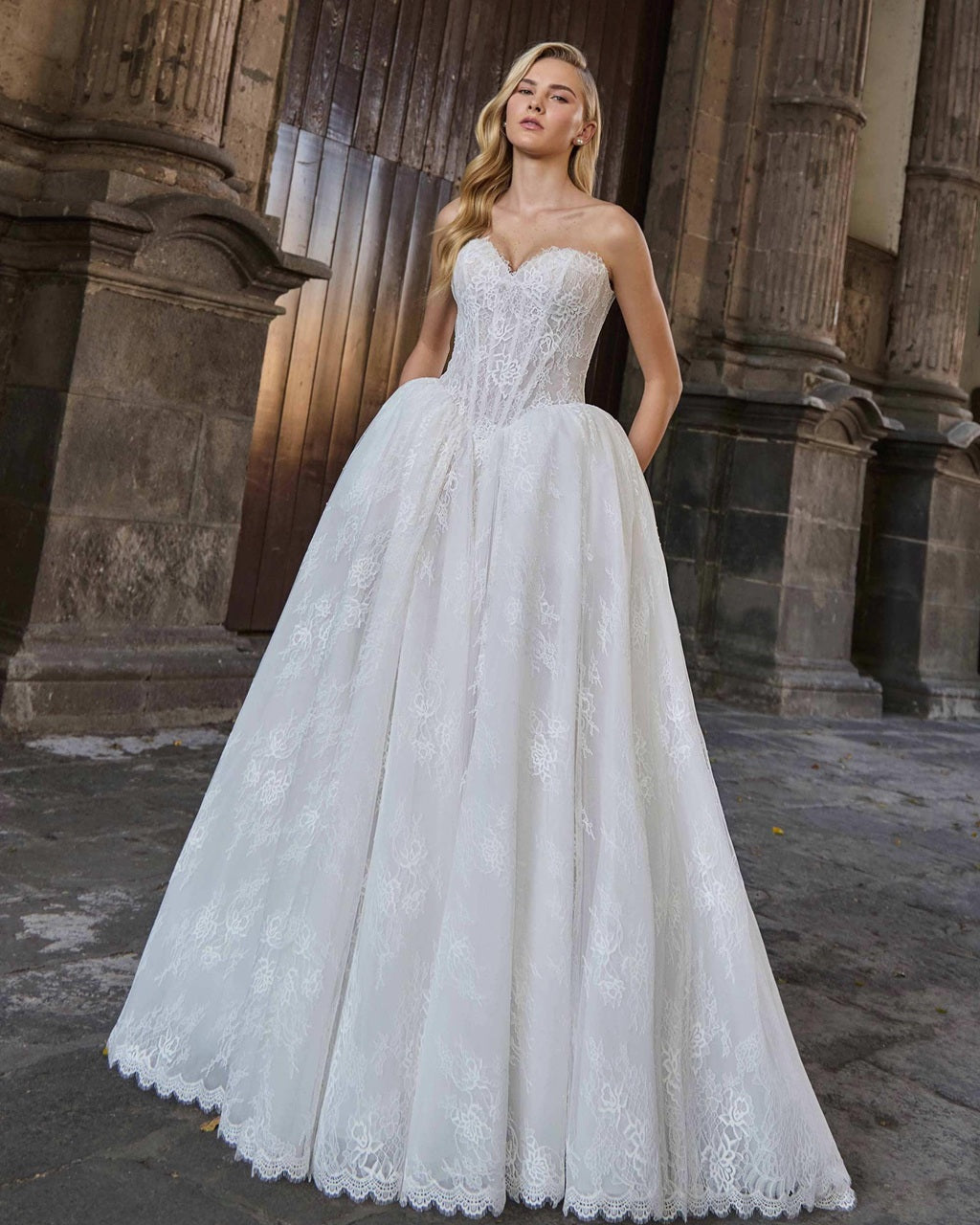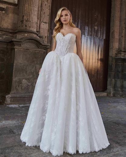 Quielle brings timeless elegance to life with its romantic vintage lace and regal ball gown silhouette. A sweetheart neckline and strapless bodice flatter the upper body, while the structured basque waistline gracefully defines the figure. Intricate lace flows seamlessly into a full skirt and sweeping train, offering a truly fairytale-worthy finish. Quielle is the perfect blend of royal charm and classic bridal beauty.