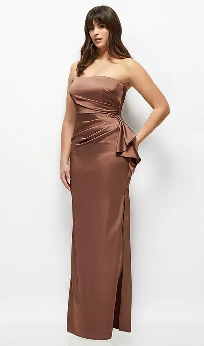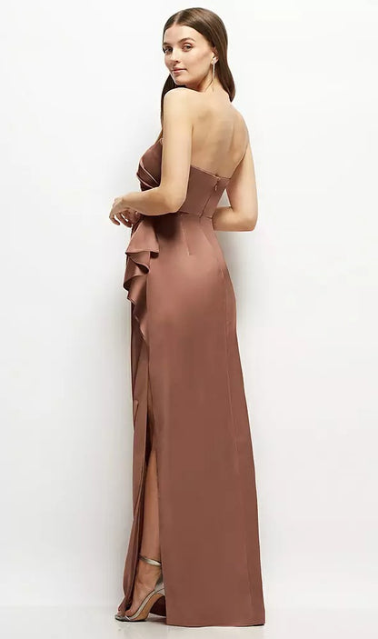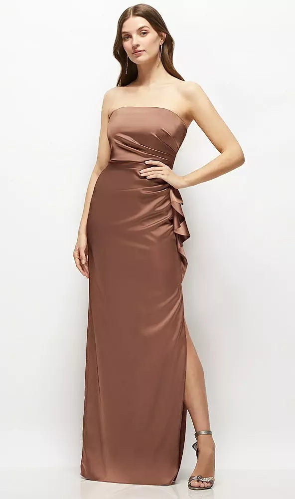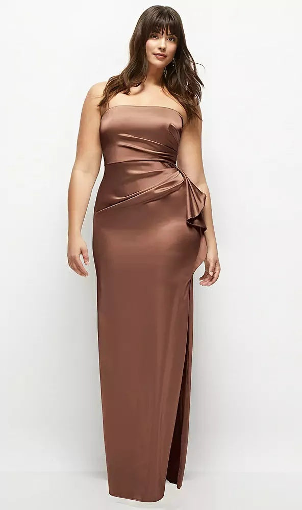 Effortlessly elegant, the Rayna bridesmaid dress is crafted in smooth neu stretch charmeuse for a luxe, body-skimming fit. The strapless bodice transitions into a draped column skirt, finished with a striking cascade ruffle and side slit for movement and drama. With its balance of sleek sophistication and playful texture, Rayna is the perfect choice for a modern, fashion-forward bridal party.