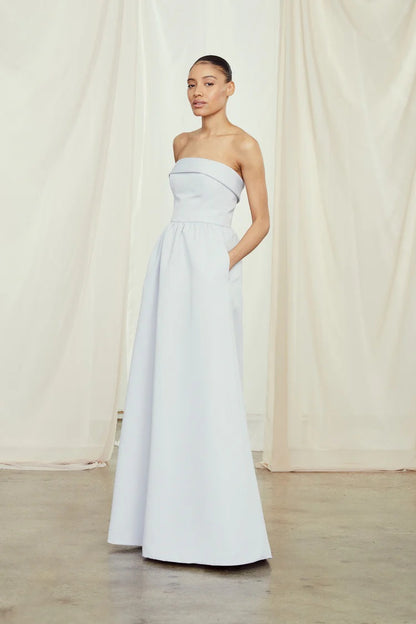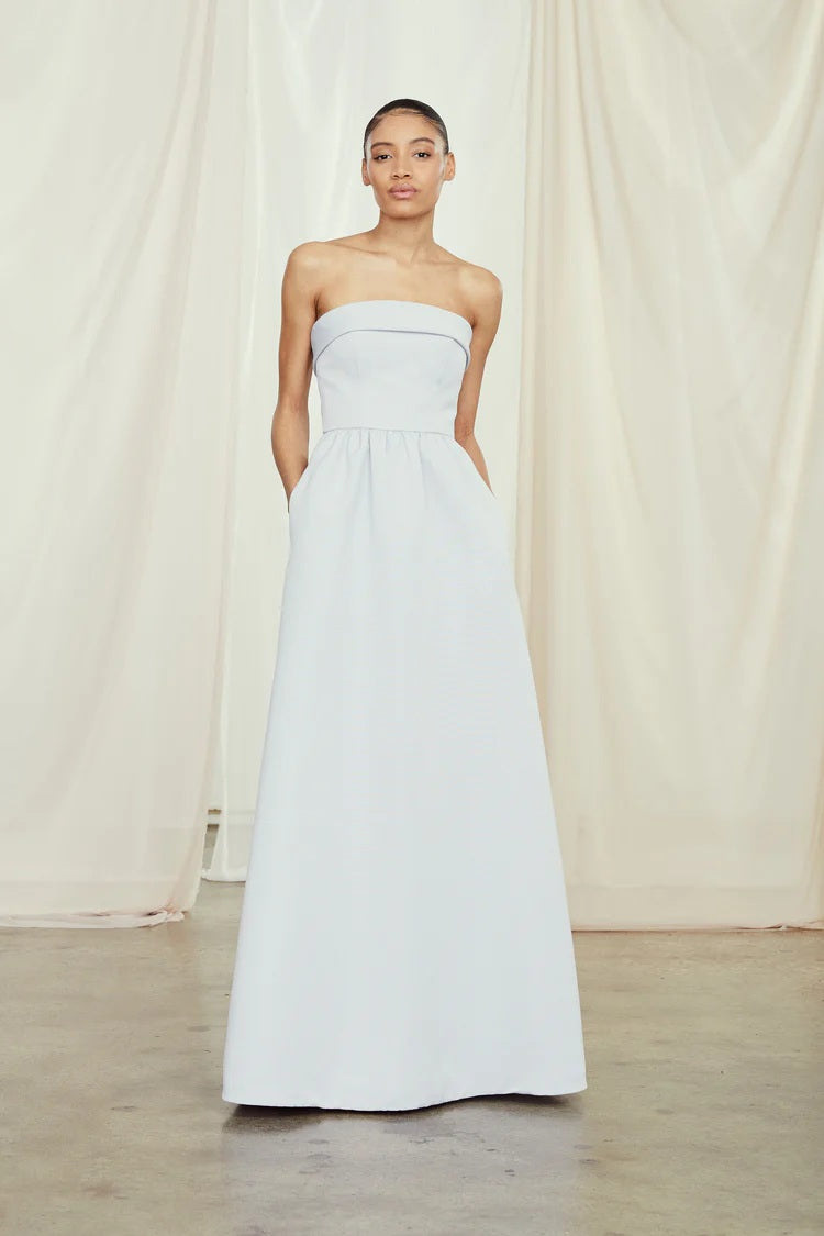 This faille bridesmaid dress blends timeless elegance with laid-back charm. Featuring a fitted, foldover strapless bodice and a full dirndl skirt, it’s designed to flatter every figure. Side pockets add a touch of practicality without sacrificing style. Shown in Ice—a cool, fresh hue perfect for any wedding setting.