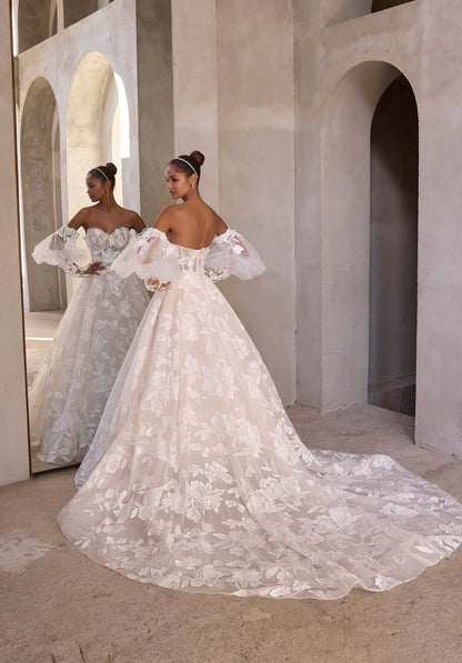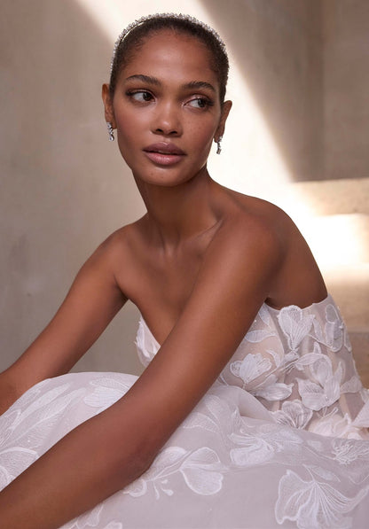 The Rodyn wedding dress is a romantic statement of texture and elegance. Its strapless cat-eye neckline highlights the collarbone with a modern twist, while detachable long puff sleeves in floral appliquéd tulle add a soft, whimsical touch.