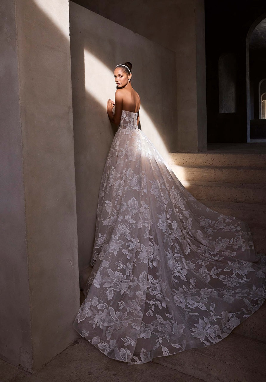 The voluminous ball gown skirt is crafted from layers of airy tulle adorned with delicate threadwork floral appliqués, creating a gown that moves like a dream. A flowing train completes this striking silhouette, perfect for the bride who wants both drama and femininity on her wedding day.