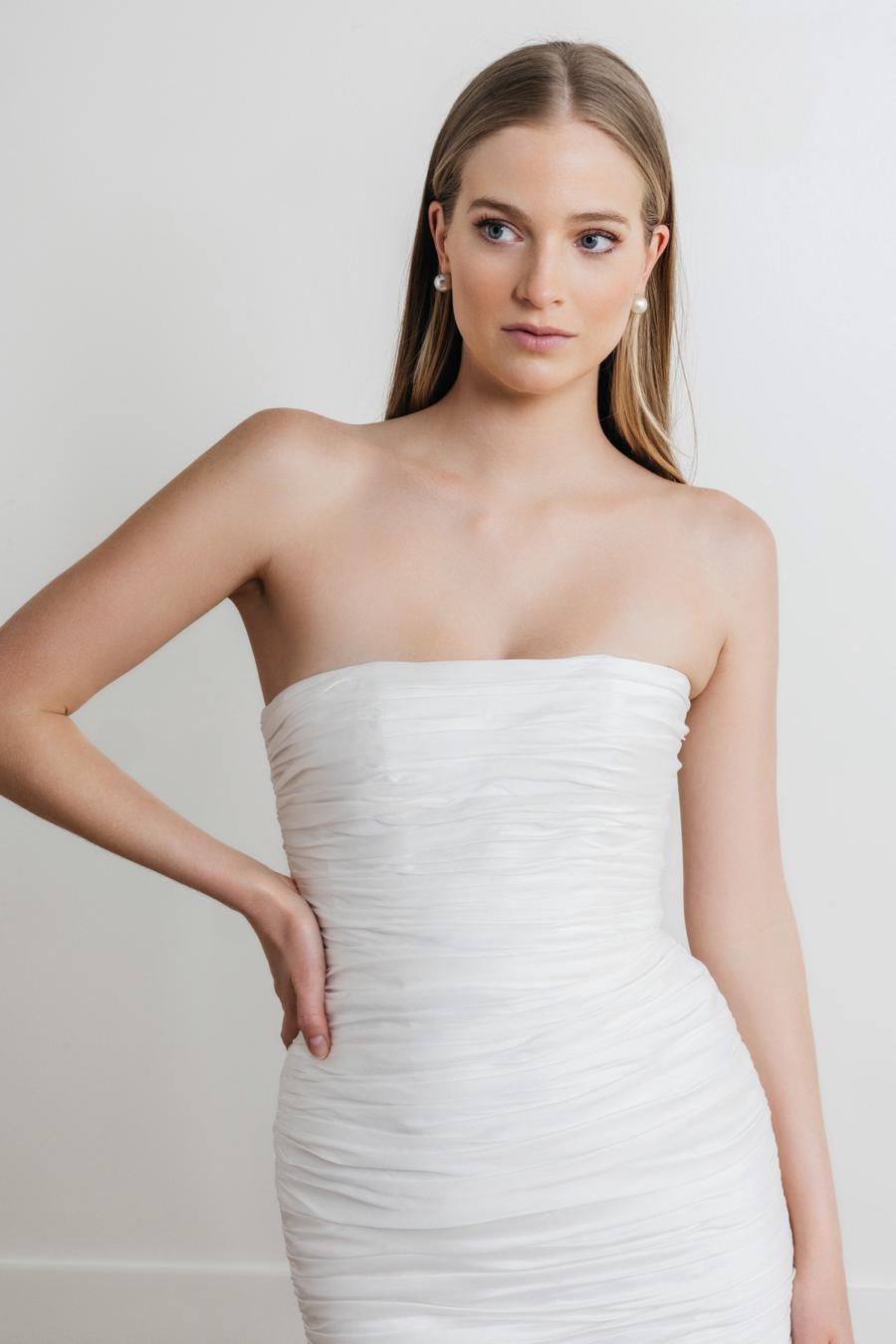 Radiant Taffeta fabric is gathered throughout the Rose-colored dress to form a sleek and alluring shape. The standout feature is the large taffeta flower, which is attached as a brooch, giving you the option to style it in your own unique way!