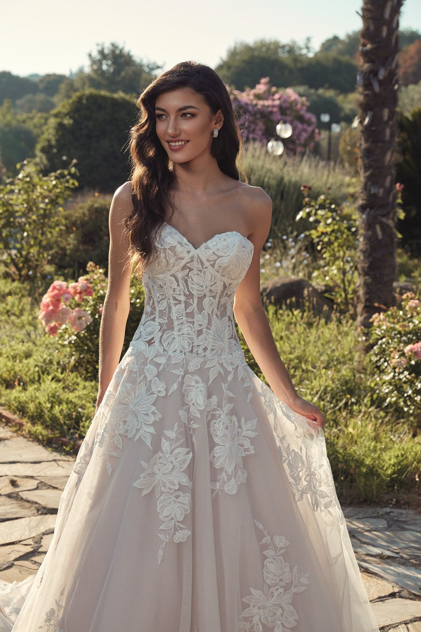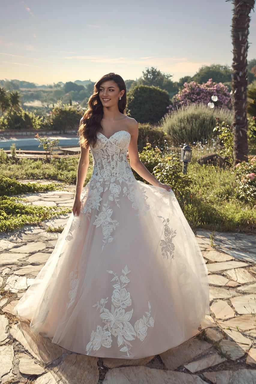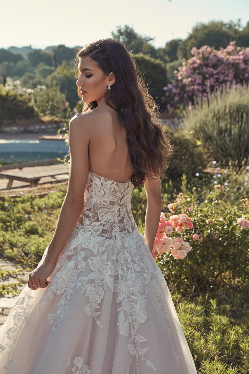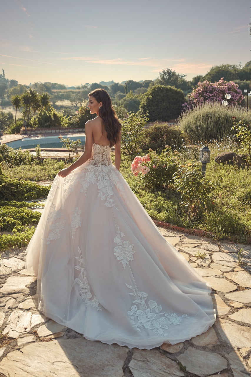 This enchanting ballgown features delicate ivory lace with minimal beading over ivory and lavender tulle layers, creating a dreamy, sophisticated look. The strapless bodice, unlined to showcase a skin-tone effect, is crafted in a classic sweetheart neckline, adding elegance and allure. Designed with a form-fitting bodice that flares into a complete, voluminous skirt, this gown combines timeless lace details with subtle lavender undertones for a soft pop of color. Finished with buttons cascading down to the end of the train, this dress is the perfect blend of romance and refinement.