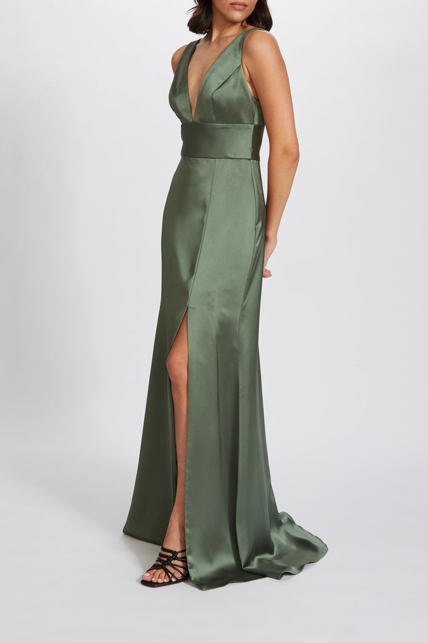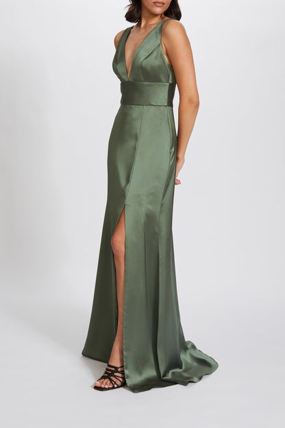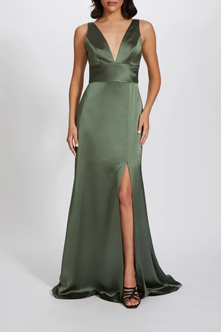 This fluid satin bridesmaid dress features a classic V-neckline and a front skirt split for a touch of modern movement. The smooth satin fabric drapes beautifully, creating an elegant and timeless look. Shown in Olive—a rich, earthy tone perfect for any season.
