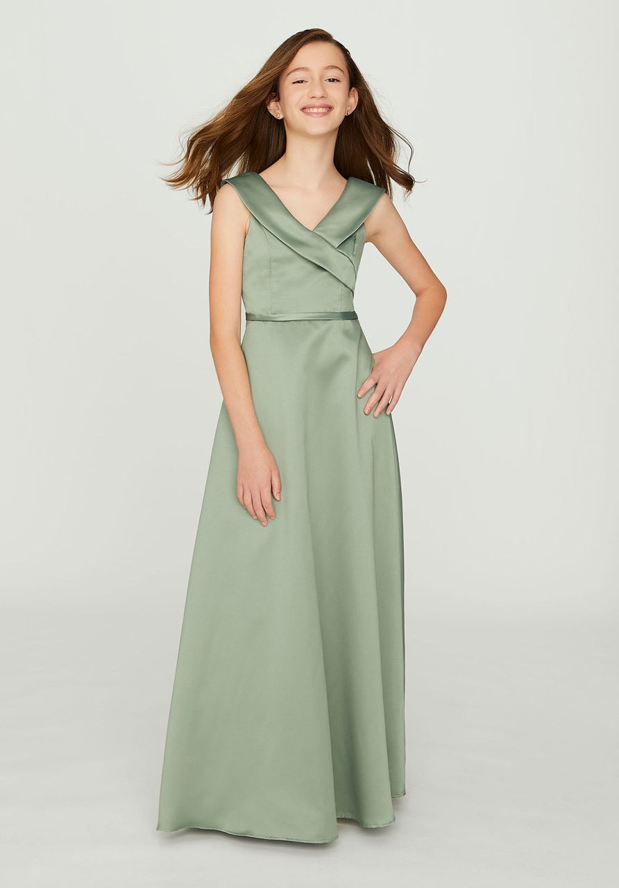 This satin junior bridesmaid dress features a flattering V-neckline and a cuffed surplice bodice for a polished, sophisticated look. A banded waist defines the silhouette, creating a timeless style that’s perfect for your youngest bridal party member.