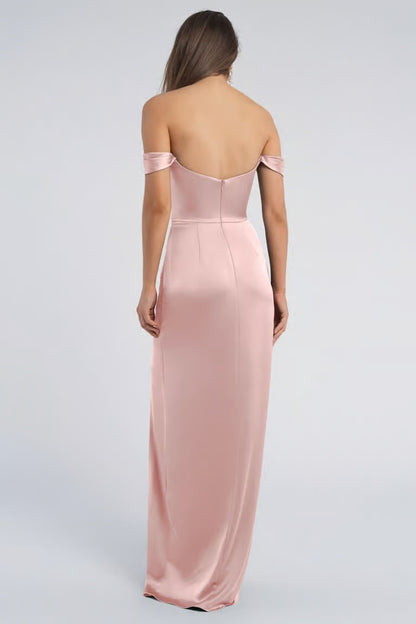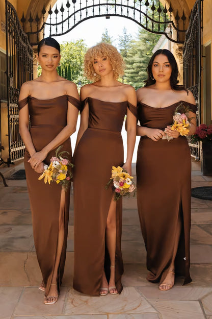 Elegant and luminous, the Sawyer bridesmaid dress is crafted from luxe satin and designed to flatter from every angle. A soft cowl neckline and draped off-the-shoulder sleeves offer timeless romance, while the fully boned bodice with bust cups ensures a secure, sculpted fit. The slim pegged skirt is finished with a cutaway princess seam slit—adding a graceful, modern touch to this beautifully balanced silhouette.