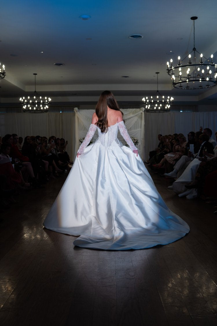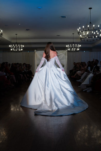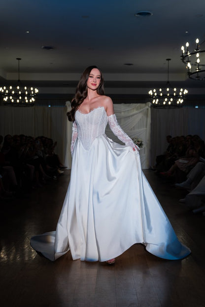 Elevate your bridal look with the breathtaking Shay wedding dress, a modern ballgown that exudes timeless romance. The structured bodice features delicate lace with a pointed basque front and back, sculpting the waist for a flattering, corset-inspired silhouette. Soft off-the-shoulder lace sleeves add a touch of elegance, while the voluminous satin skirt flows into a dramatic train that glides effortlessly down the aisle.Perfect for the bride who loves classic glamour with a modern edge, Shay is a show-stopping gown designed to make every entrance unforgettable.
