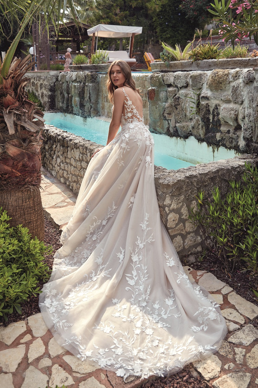 This enchanting ballgown is adorned with delicately layered ivory lace over ivory, champagne, and matte lining, creating a stunning contrast of textures. The Chantilly lace bodice adds a touch of romance and sophistication to the ensemble, while the skin illusion back adds a hint of allure. It is perfect for the bride seeking a timeless, elegant look with a touch of modernity on her special day.