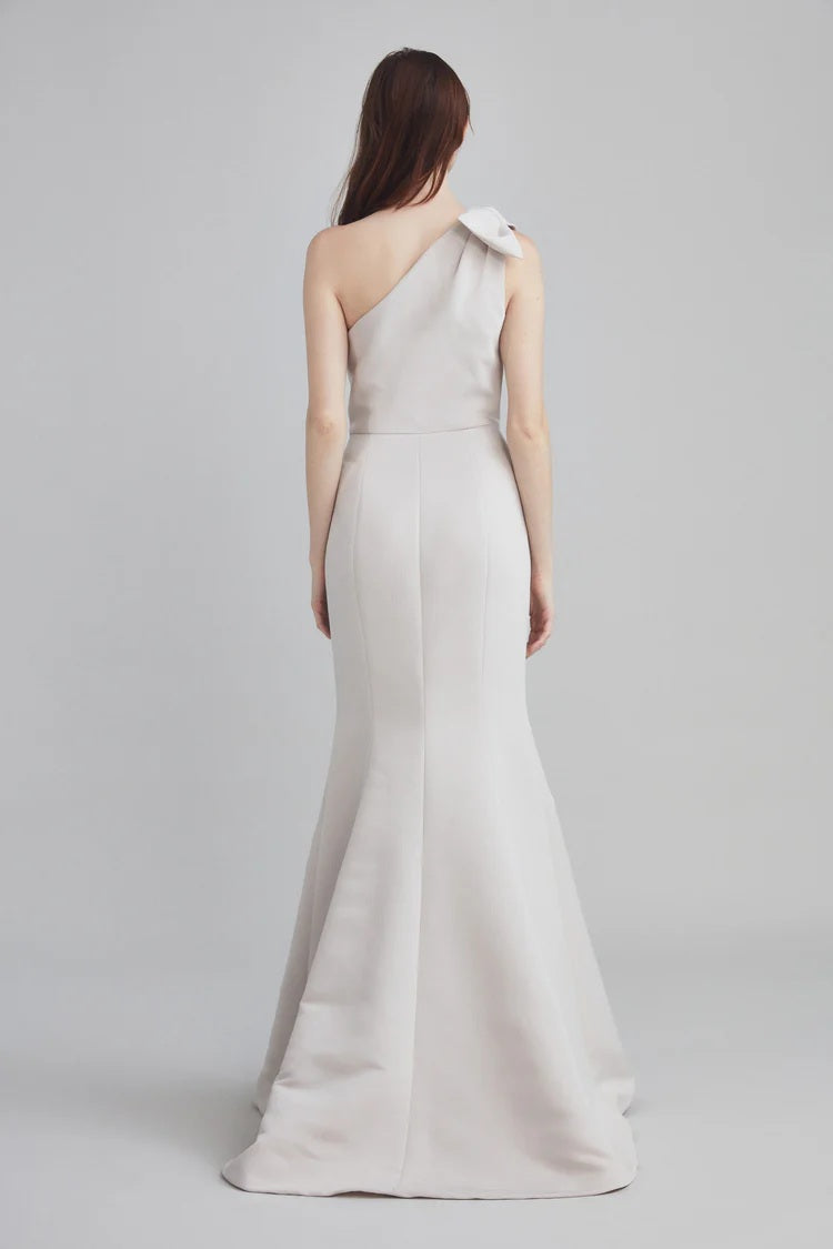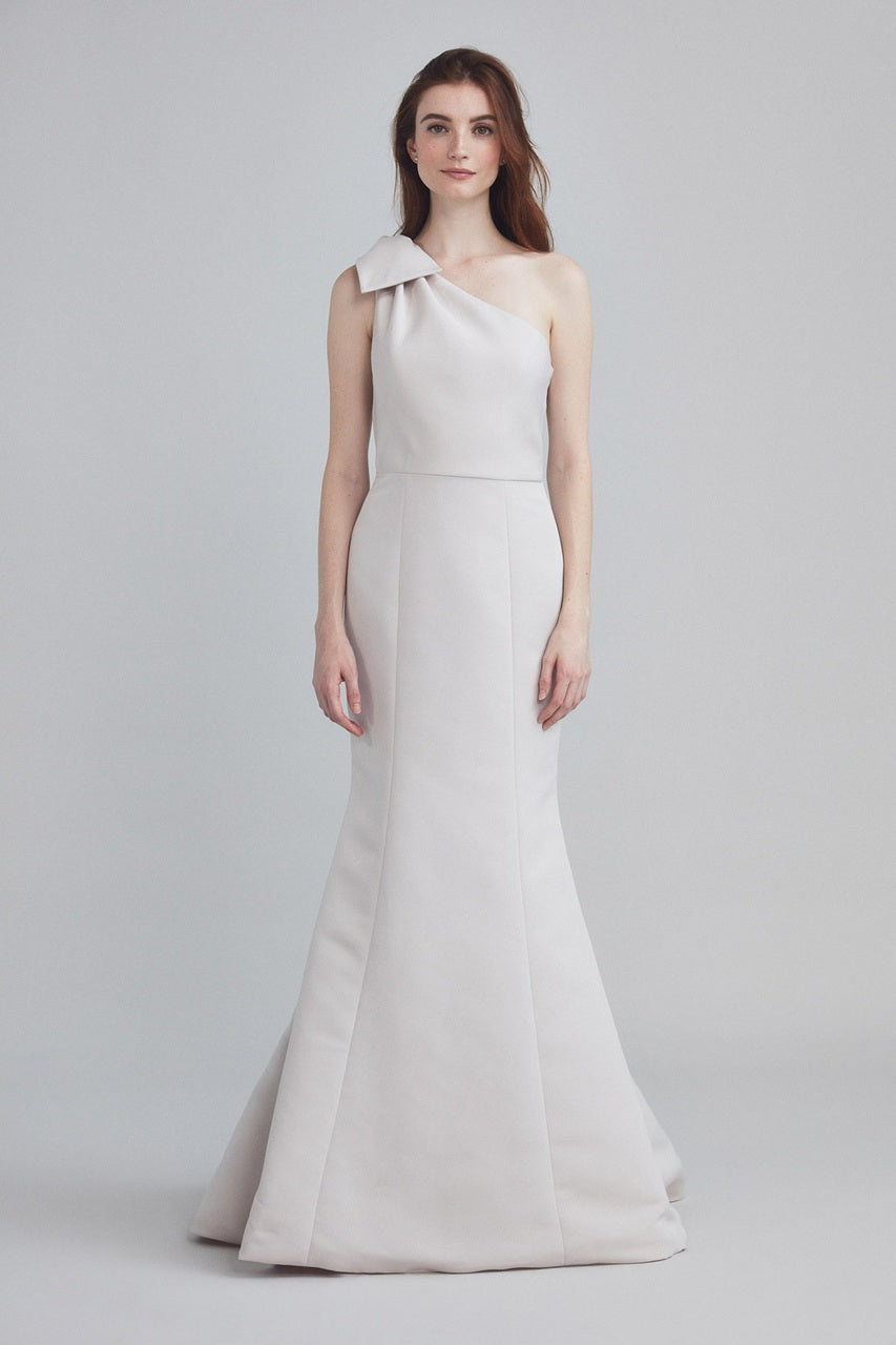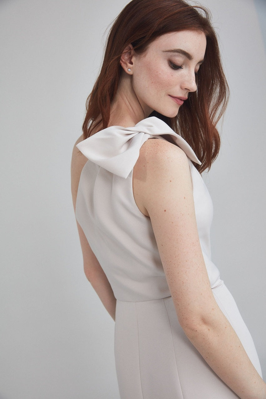 This faille bridesmaid dress features a charming shoulder bow detail and a flattering fit-to-flare silhouette. The structured fabric offers a timeless feel, while the bow adds a hint of whimsy and personality. Shown in Champagne—a soft, glowing neutral perfect for any wedding aesthetic.
