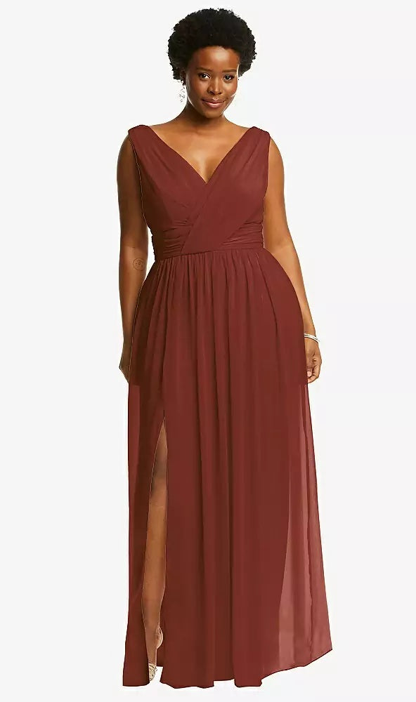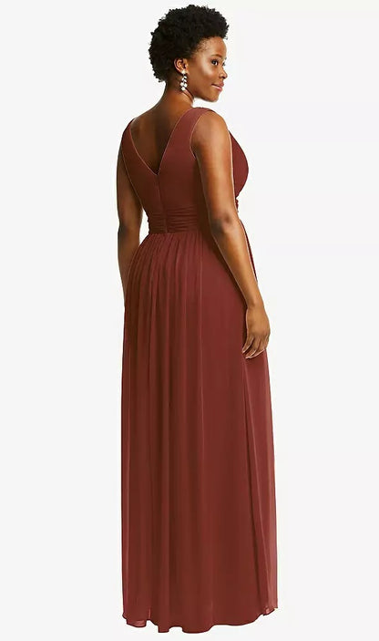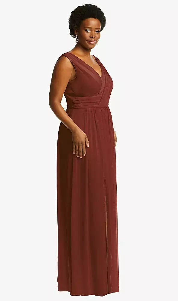 Effortlessly elegant, this full-length maxi dress is crafted from soft lux chiffon with a flattering sleeveless V-neck bodice. The softly draped neckline and shirred detailing on the front and back of the skirt add graceful texture, while the front slit brings just the right amount of movement and drama.