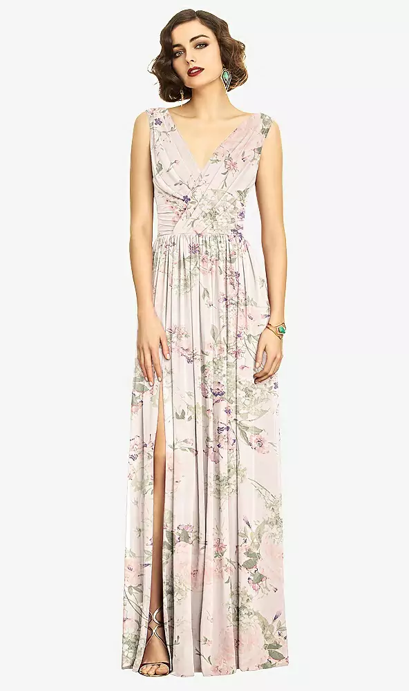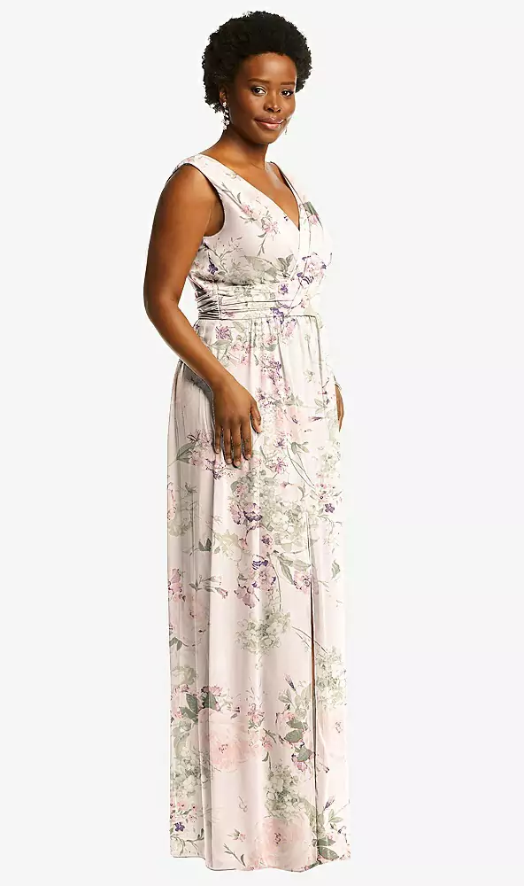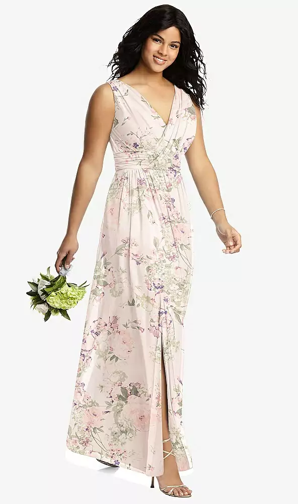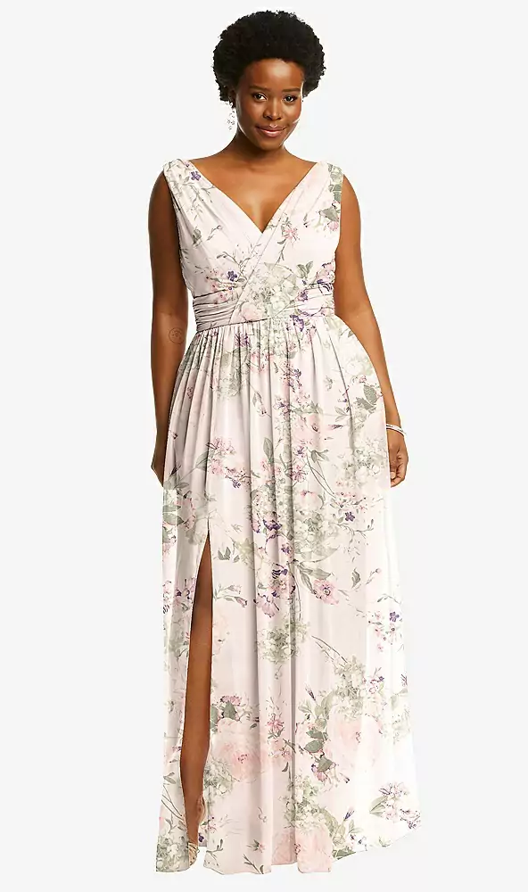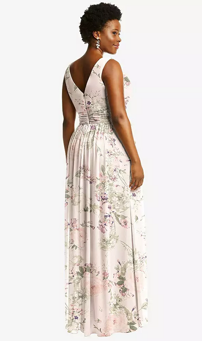 Elegant and airy, this lux chiffon bridesmaid dress features a softly draped V-neckline and a flattering sleeveless silhouette. Subtle shirring at the front and back of the skirt adds gentle texture, while the front slit brings a bold, modern edge to this timeless design. A graceful choice for both garden weddings and formal celebrations.