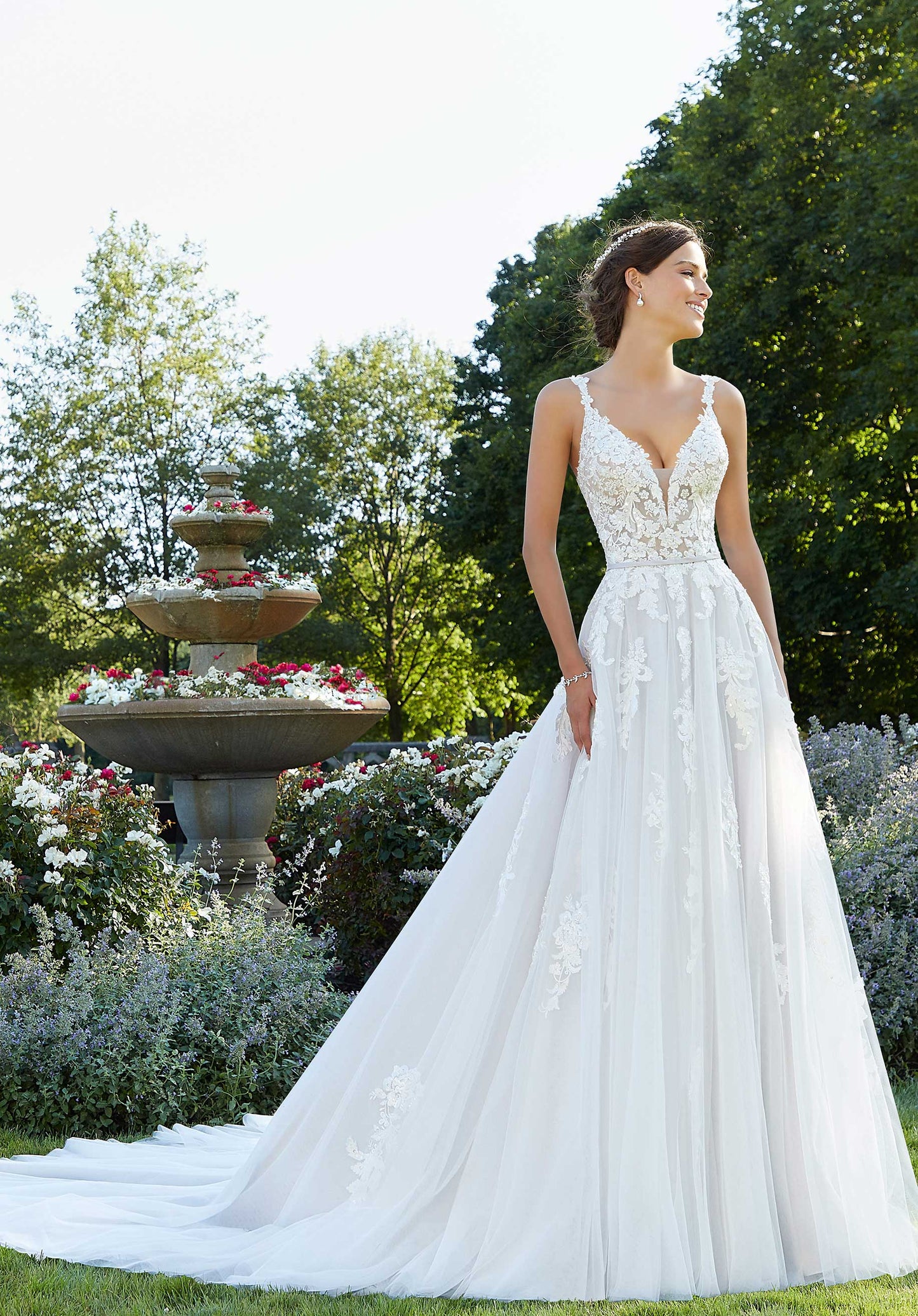 The Sparrow wedding dress features crystal and pearl beaded, embroidered lace appliqués for a romantic look on a soft net A-line silhouette with a satin waistband to define your figure. Available with front bodice lining as style 5805L.