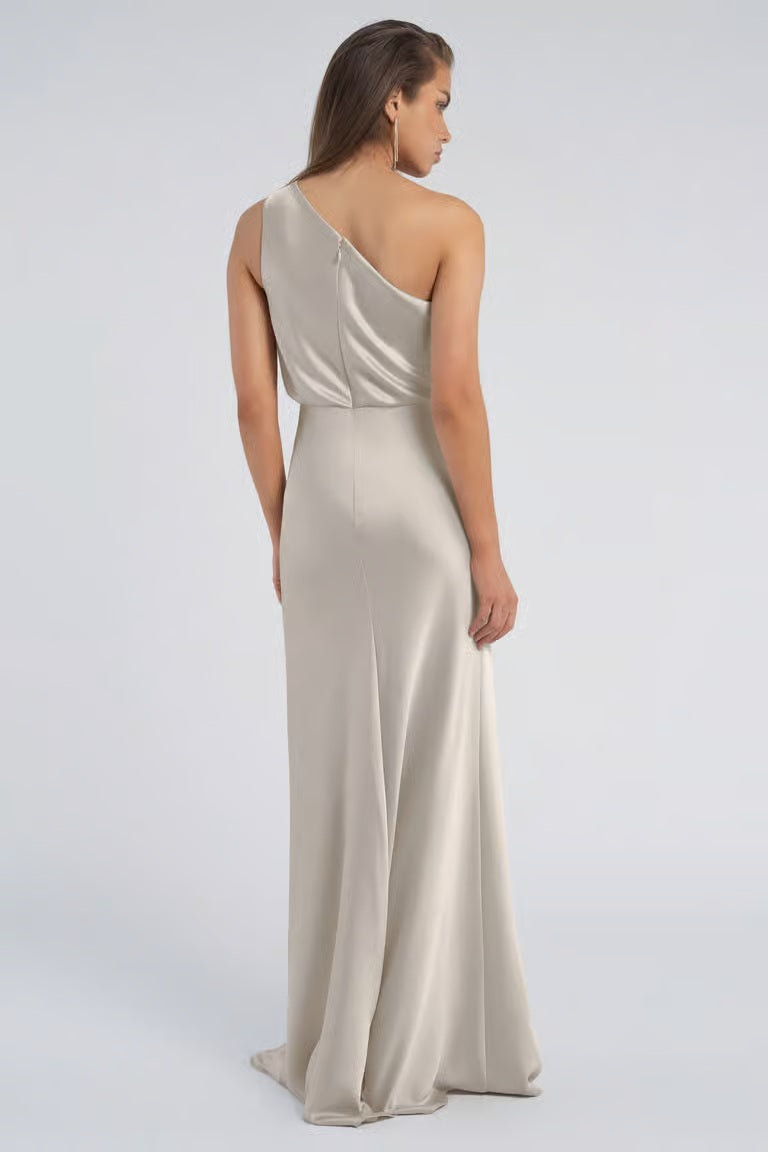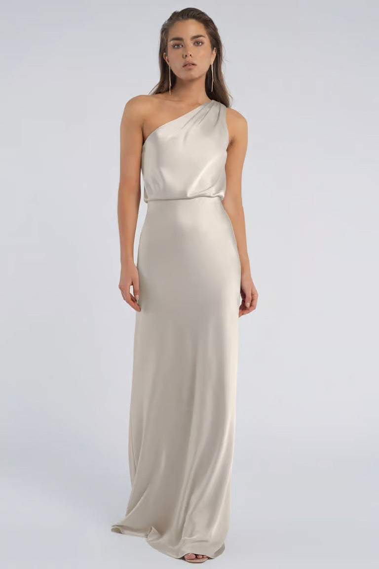 Inspired by old Hollywood glamour, the Sterling bridesmaid dress brings a modern twist to a classic silhouette. Crafted in lustrous luxe satin, this gown features an elegant one-shoulder neckline with soft pleating and a flattering blouson bodice. The bias-cut skirt skims the body with graceful ease, creating a sleek, polished look that moves effortlessly from ceremony to celebration.