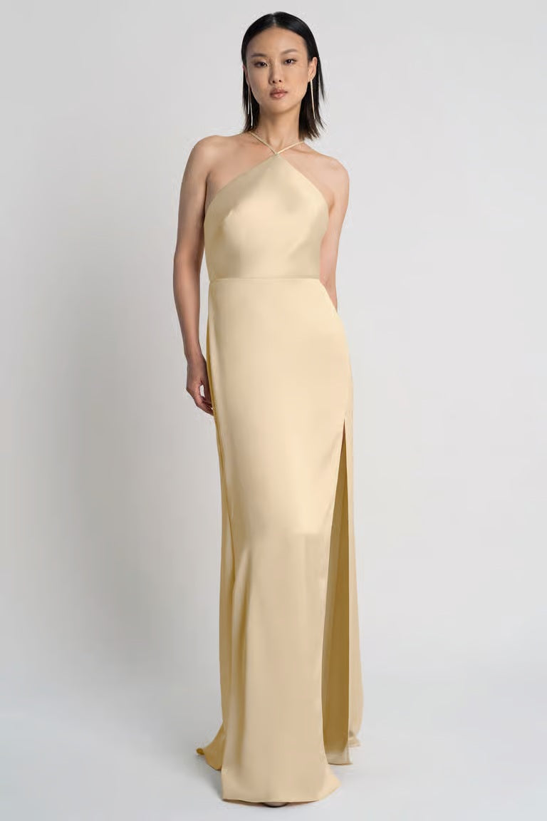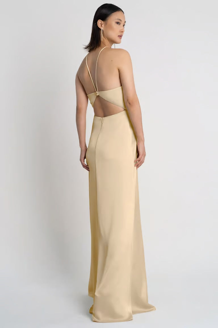 A fresh take on a classic silhouette, the Summer bridesmaid dress is equal parts sleek and striking. Crafted in luxe satin, it features a pointed halter neckline and slim spaghetti straps that lead to a modern cutout back detail. The slim A-line skirt flatters with soft structure and a daring side slit—perfect for the bridesmaid who wants timeless elegance with a twist.