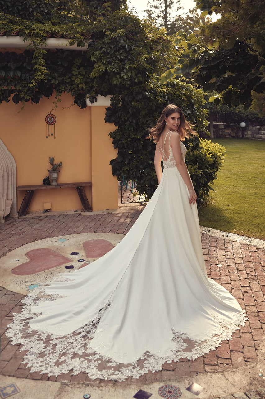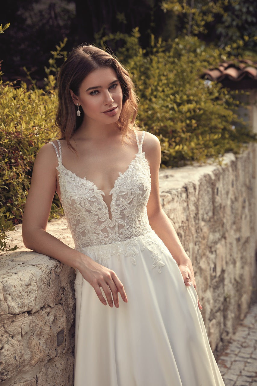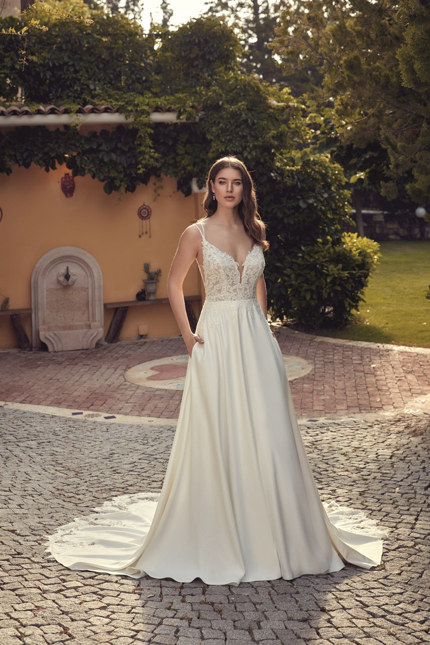 This A-line gown exudes elegance with its beaded ivory lace and sequins delicately embellished over satin fabric. The unlined Chantilly lace bodice adds a touch of romantic allure, creating a beautiful contrast against the skin. The gown features beaded straps for added sophistication, convenient pockets for practicality, and buttons trailing along the illusion train for a classic finishing touch. It is perfect for the bride seeking a blend of timeless charm and modern sophistication on her special day.