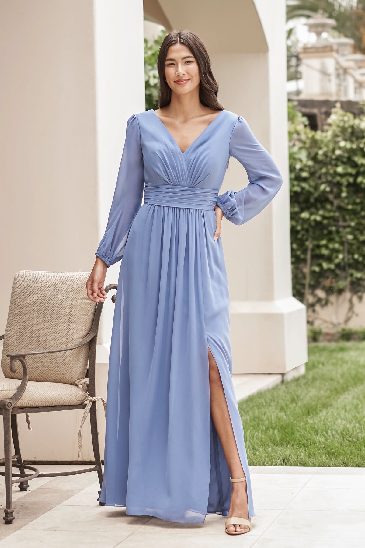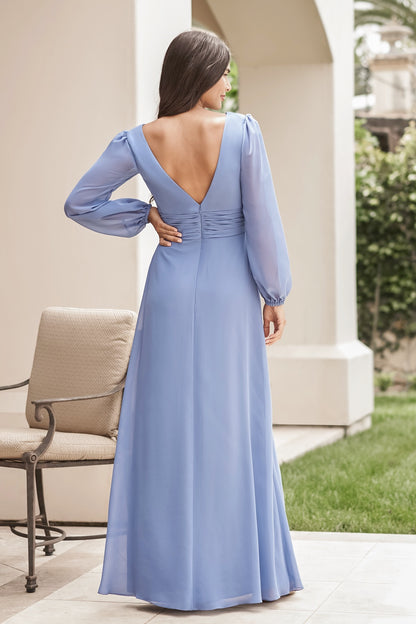 Graceful and romantic, this poly chiffon bridesmaid dress blends soft structure with dreamy details. The pleated bodice and gathered wide waistband flatter the figure, while the V-necklines in front and back add timeless elegance. Finished with sheer bishop sleeves and a flowing A-line skirt with a front slit, this gown brings effortless beauty to every aisle moment.
