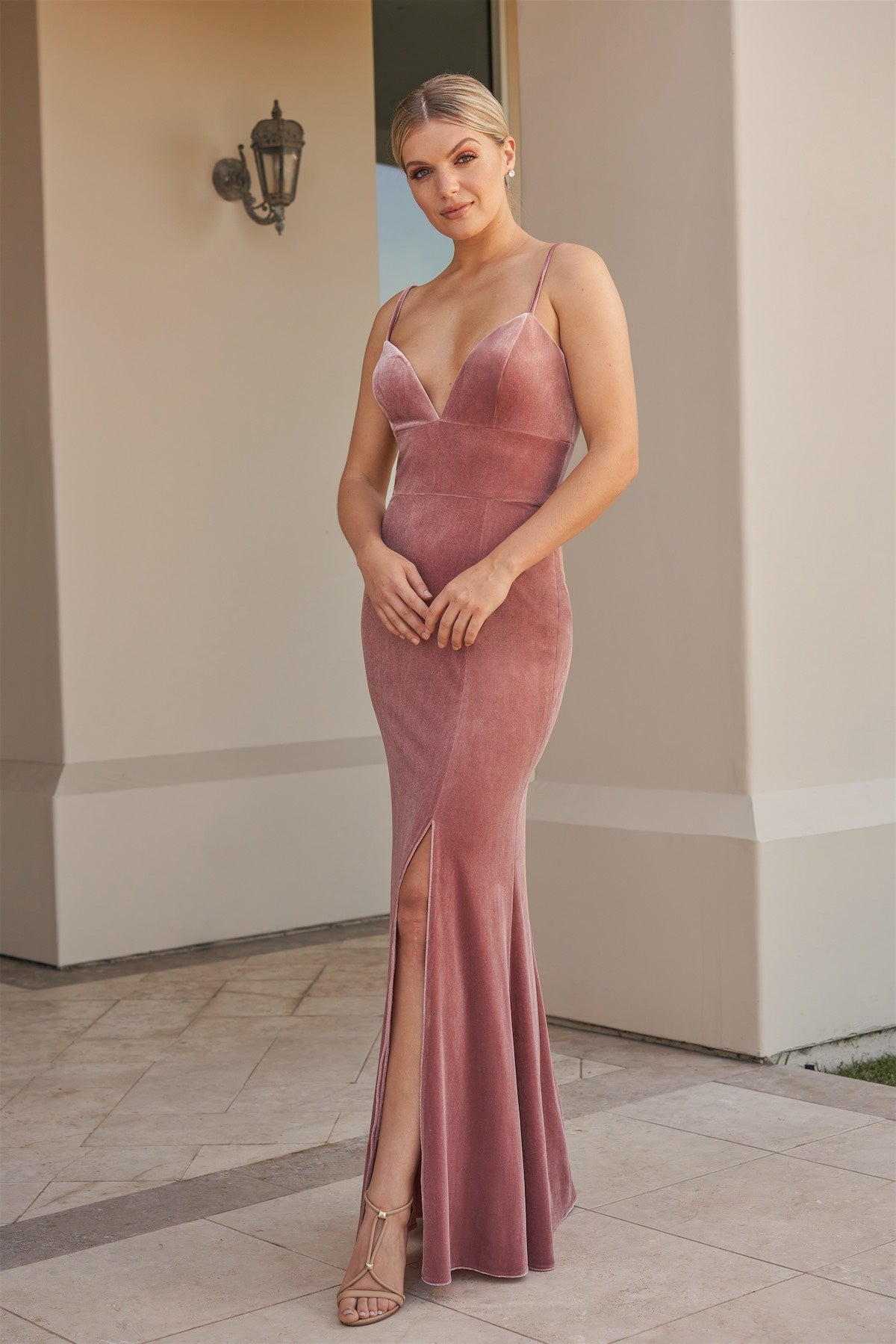 Confident and curve-hugging, this stretch velvet bridesmaid dress makes a bold yet elegant statement. The plunging V-neckline and slim spaghetti straps draw the eye upward, while a high waistband flatters the figure by defining the waist. The fit-and-flare skirt flows softly over your shape with a front slit for graceful movement. A matching V-back adds allure from every angle—perfect for a showstopping bridal party look.