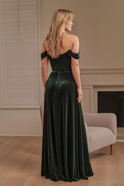 Captivating and refined, this stretch velvet bridesmaid dress pairs classic charm with flattering detail. The pleated portrait swag neckline gently drapes off the shoulders, complementing the structured sweetheart bodice and natural waistline. The A-line skirt flows effortlessly with a front princess seam slit, while the sculpted back neckline catches the portrait drape for an elegant finish that’s stunning from every angle.