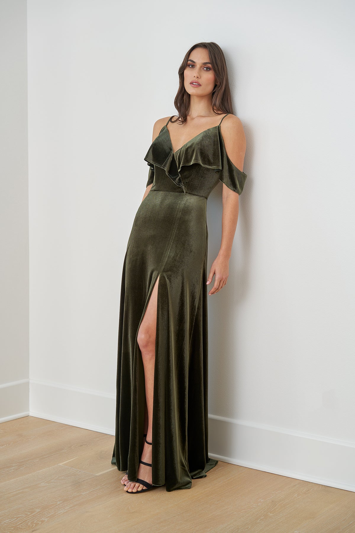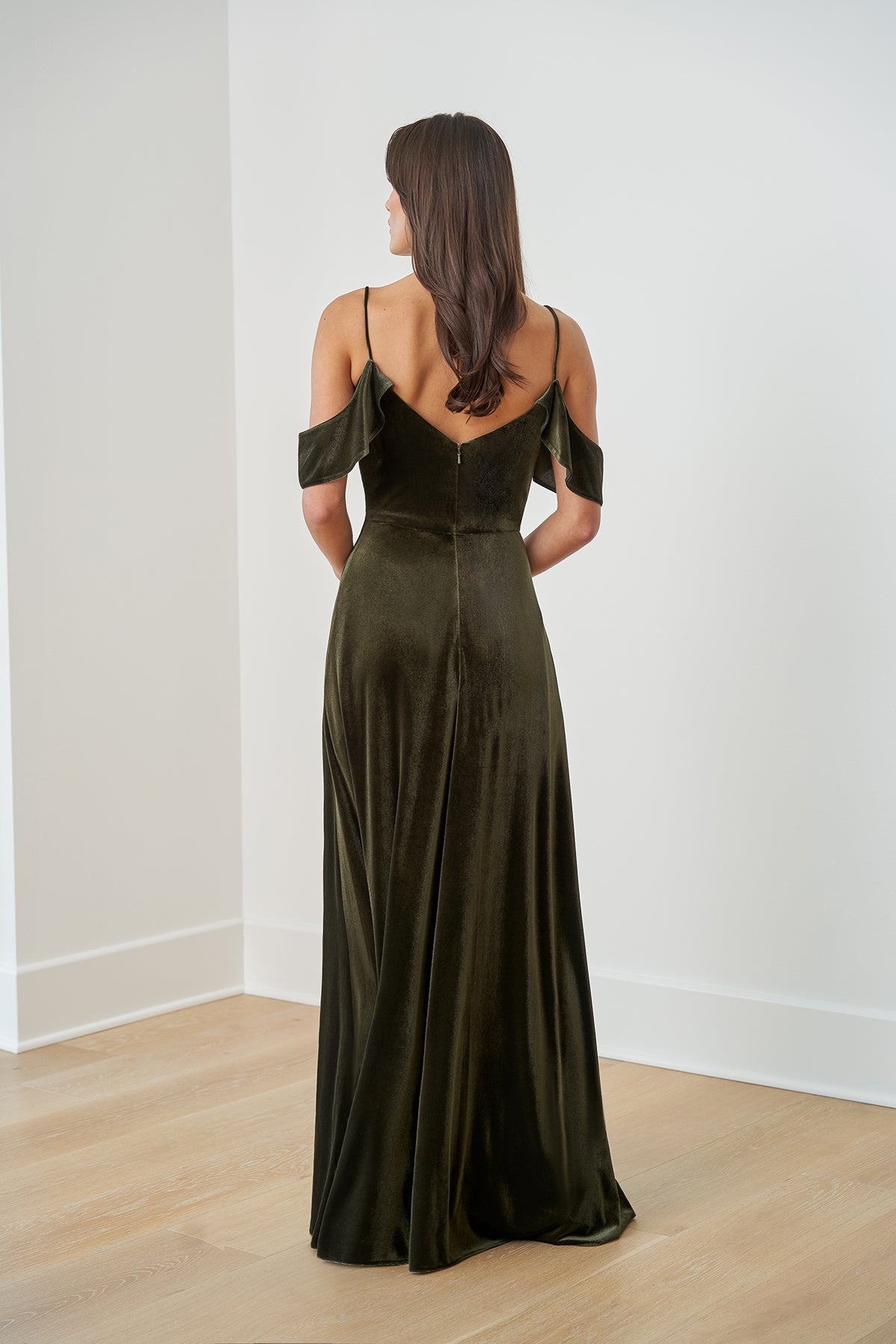 Whimsical and romantic, this stretch velvet bridesmaid dress is a standout for fall and winter celebrations. The softly ruffled bodice flows into delicate swag sleeves that frame a flattering V-neckline and continue around the back with a gentle dip. An A-line skirt with hidden pockets and a front slit adds effortless movement—making this gown equal parts charming and comfortable.