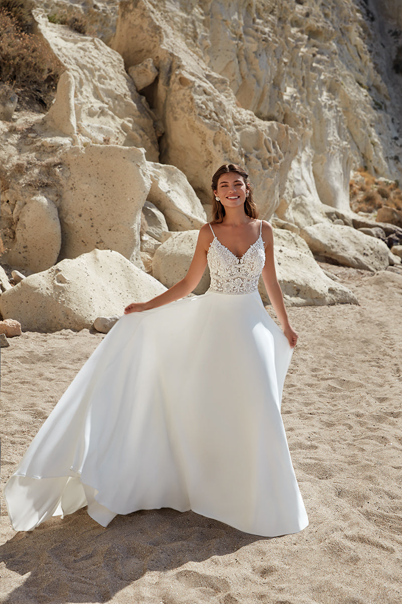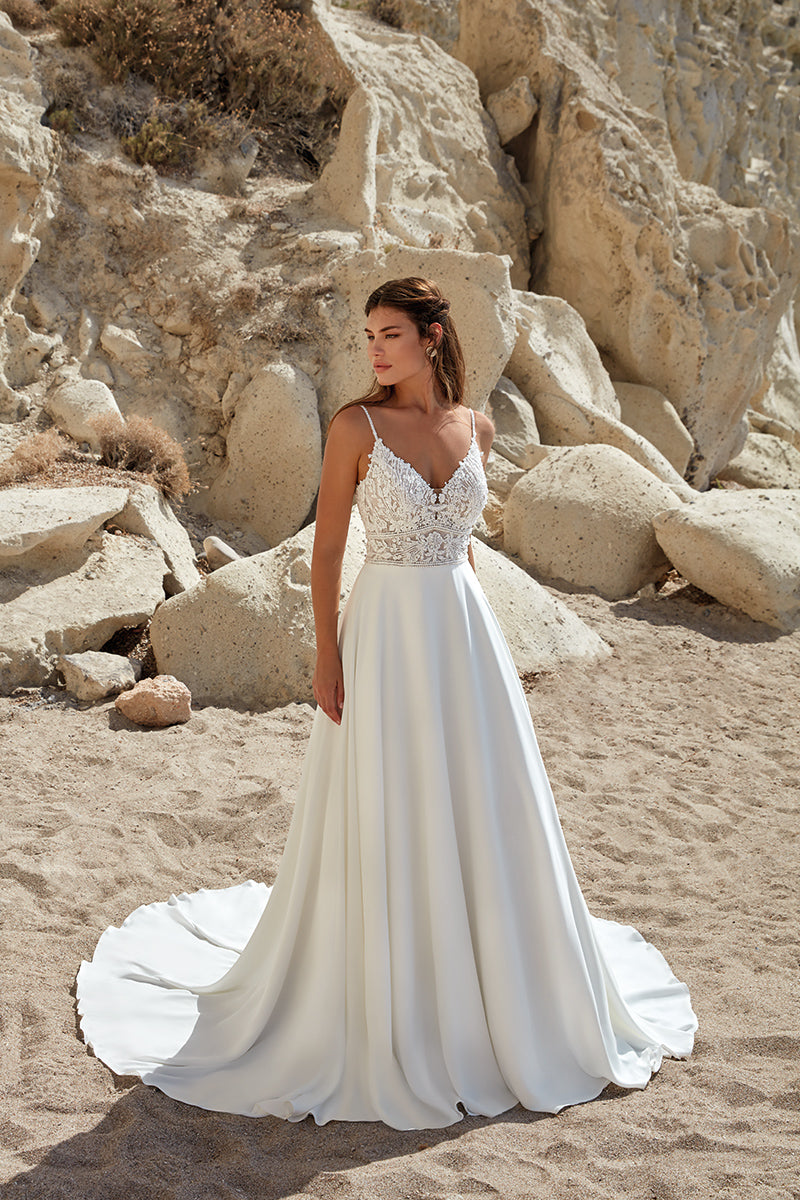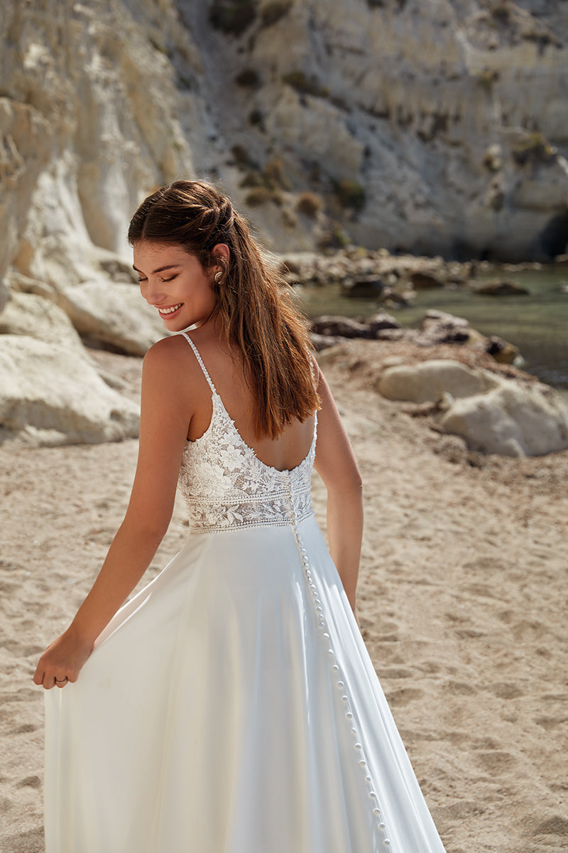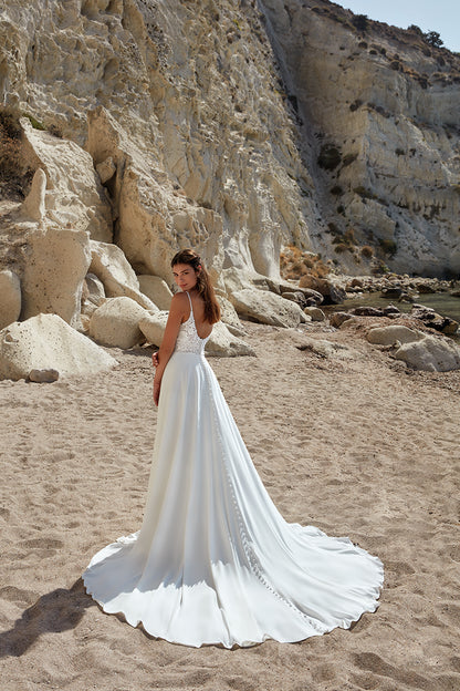 This enchanting gown features delicate lace adorned with sequins and beads layered over Chantilly lace and champagne tulle, creating a breathtaking and ethereal effect. The transparent bodice adds a modern and alluring touch, while the ivory crepe skirt provides a sleek and elegant silhouette. Fabric buttons trail along the back to the end of the train, adding a classic and refined finishing touch to this stunning ensemble. Perfect for the bride seeking a blend of timeless elegance and contemporary sophistication on her special day.